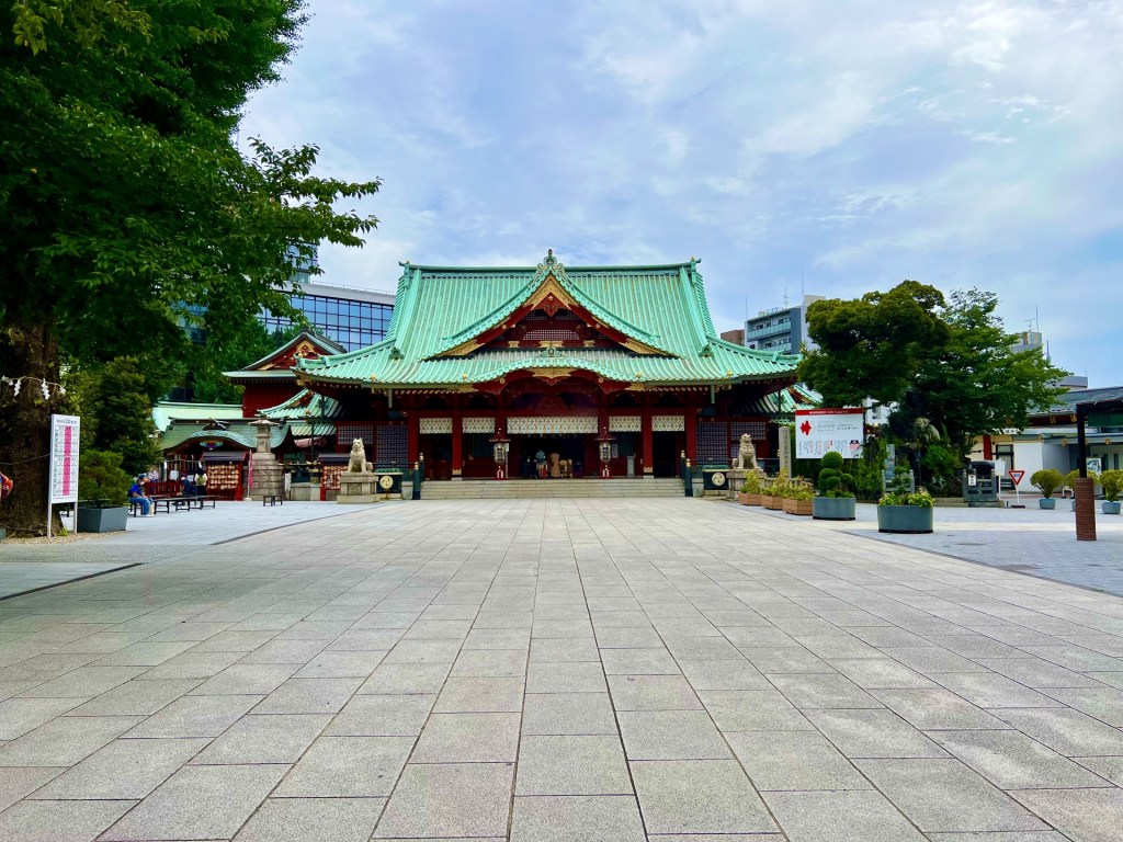 概要:日枝神社(ひえじんじゃ)は永田町(赤坂)に鎮座し、江戸城(現在の皇居)の守護神として古くから崇敬されてきた神社です。創建年代は不詳ですが、文明10年(1478年)に太田道灌が江戸城内に京都・比叡山の山王権現を勧請したのが始まりとされます。その後、江戸城外堀の山王台(現在地)に移され、徳川幕府から「江戸城鎮護」の社として篤く信仰されました。山王祭は神田祭・深川祭と並ぶ江戸三大祭として江戸の賑わいを象徴しました。日枝神社は社殿の左右に猿の像が鎮座し、「山王さん」の愛称でも親しまれています。現在の社殿は昭和40年に造営された鉄筋コンクリートの近代的な造りで、鮮やかな朱色が青空に映える姿が印象的です。
