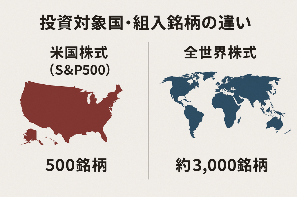 なお、世界株式に占める米国株の割合は時価総額ベースで約60%と言われており、両ファンドの投資対象は米国企業でかなり重複します。そのため、両方を同時に買うと米国株のウェートが非常に高くなり、リスク分散効果が薄れます。逆に言うと、全世界株式を選んだ場合でも米国株の成長を同時に取り込むことができ、初心者にはそれだけで十分な米国株エクスポージャーになります。