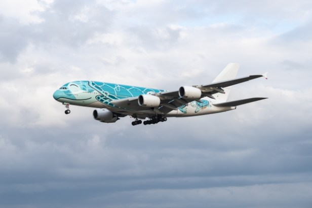 ANA(全日本空輸) – JALと並ぶ日系大手で、羽田・成田から毎日運航しています。最大の特徴はハワイ路線専用の大型機「FLYING HONU(フライング・ホヌ)」を導入していること。ウミガメをあしらった可愛いデザインの二階建てA380機材で、エコノミーでも座席のゆとりがあり快適です。例えばエコノミー席幅が約44cm・シートピッチ約86cmと広めで、長時間のフライトも楽に過ごせると評判です。子連れ家族向けには横並び席をベッド状にできる「カウチシート」(有料)も導入し、小さな子どもとの初ハワイでも安心ですね。