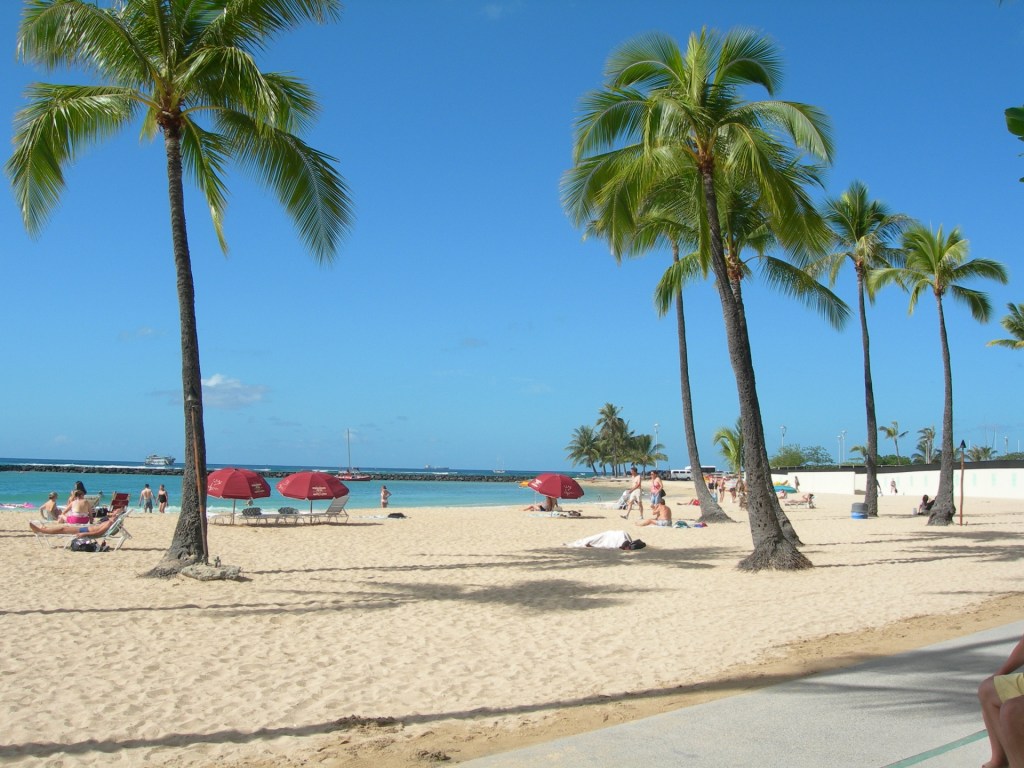 ワイキキビーチ周辺 – 言わずと知れたハワイの象徴、ワイキキビーチ。エメラルドグリーンの海と白い砂浜が約3kmにわたって続く景色はまさに南国の楽園です。ビーチ沿いにはヤシの木が揺れ、ビキニ姿で日光浴を楽しむ人やサーフィンに挑戦する初心者の姿も見られ、いつでも明るいリゾート気分に浸れます。ワイキキ周辺には高級ブランド店が立ち並ぶカラカウア通りや、気軽に入れるABCストア、カフェやレストランも点在しており、海水浴の合間にショッピングや食べ歩きも楽しめます。初心者向けのサーフィンレッスンやSUP(スタンドアップパドル)体験も充実しているので、家族連れなら子どもと一緒に浅瀬で波乗り体験、カップルならサンセットタイムにビーチ沿いを散策してロマンチックな夕日を満喫、ひとり旅でも気ままに波打ち際を歩いたり本を読んだりと自由に過ごせます。日が沈むとビーチはまた違った雰囲気に包まれ、水平線に沈む真っ赤な夕日は心に残る絶景です。ワイキキは昼も夜も安全で賑やかなエリアなので、初心者にも安心して楽しめるでしょう。