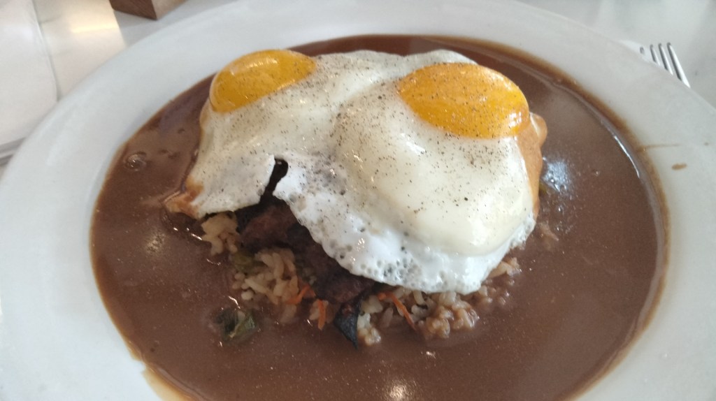 1. ロコモコ – ハワイを代表するローカルフードと言えばこれ!ご飯の上に肉厚ジューシーなハンバーグと半熟の目玉焼きを乗せて、コクのあるブラウングレービーソースをたっぷりかけた丼ぶりのような料理です。もともとは「安くて腹持ちの良い食事」として生まれたロコモコですが、今ではプレートランチから有名レストランのメニューにまで登場するハワイのソウルフードになりました。とろりと黄身が流れる目玉焼きと肉汁ソースがご飯に絡んで、日本人にもなじむ美味しさです。ワイキキ周辺でロコモコを味わうなら、創業60年超の老舗プレートランチ店「Rainbow Drive-In(レインボー・ドライブイン)」が有名。ロコモコプレートは約10ドルとお手頃で、ローカルも観光客も行列する人気店です。また最近はおしゃれカフェ風にアレンジしたヘルシーロコモコを出す店もあります。朝食メニューで提供する店もあるので、朝からがっつりロコモコでエネルギーチャージするのも良いですね。