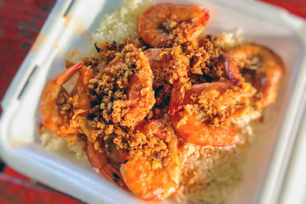 2. ガーリックシュリンプ – ハワイの屋台グルメの王様とも言える一品。殻付きのプリプリ海老を丸ごとバターとニンニクで豪快に炒め、ご飯やサラダと一緒にワンプレートに盛り付けたものです。ニンニクのパンチが効いた香ばしいソースとエビの旨味が相まって、一度食べたらやみつき!本場はオアフ島北部ノースショアに点在するシュリンプトラック(移動販売車)で、中でも「ジョバンニズ(Giovanni’s)」は草分け的存在。プレート一皿15ドル前後で、ガーリック醤油味やレモンバター味など数種類から選べます。お皿いっぱいに並んだエビは迫力満点で、手をニンニクまみれにしながら豪快にかぶりつくのがローカル流の楽しみ方。ワイキキ周辺でもシュリンプ料理を出すお店は増えており、「パウズ・キッチン」などのフードトラックがアラモアナ付近に出店しています。特に食べ盛りの若者や男性には大人気で、ご飯がモリモリ進む味ですよ。「ハワイに来たらまずシュリンプを食え!」という人もいるほど定番なので、ぜひ熱々のうちに召し上がれ。