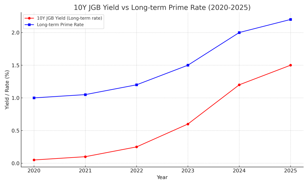 図:10年物国債金利(赤線)と長期プライムレート(青線)の推移。10年国債利回り(長期金利)が2022年以降上昇しており、それに追随するように長期プライムレートも上昇している。長期プライムレートは銀行の長期貸出の基準金利で、住宅ローンの長期固定金利(店頭表示金利)に反映される。