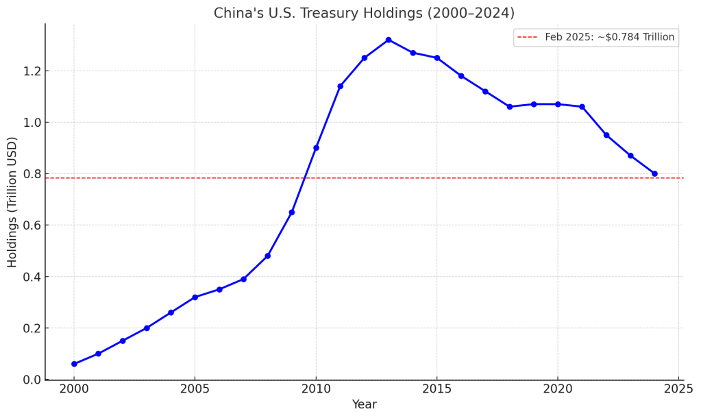 中国はこれまで長年にわたり、日本に次ぐ米国債の主要保有国でしたが、ここ数年で保有額を大きく減らしています。実際、中国の米国債保有残高は2013年の約1.32兆ドルをピークに減少を続け、2025年2月時点では約7,840億ドルと12年前の半分近くにまで落ち込んでいます。この規模は米国債全体の発行残高(約28兆ドル)の3%未満で、かつて2011年には14%を占めていた比率から大きく低下しています。下の図が示すように、中国の米国債保有残高は近年急速に減少し、2000年代後半以来の低水準となっています。