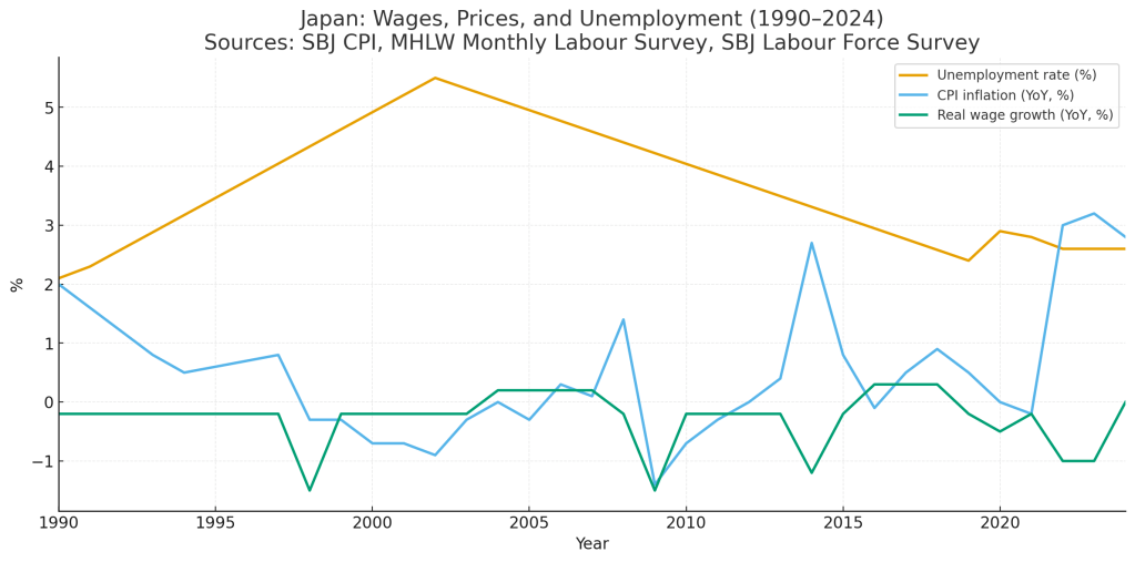 しかし、この回復期にもデフレは完全には解消せず、CPIはゼロ近辺で推移しました。賃金も伸び悩み、個人消費の回復は輸出や企業収益ほど強くありませんでした。企業はグローバル競争を勝ち抜くため国内人件費抑制を続け、中国など新興国の安価な労働力との競争もあって、ベースアップ(賃金底上げ)は2000年代を通じてほとんど行われませんでした。「安いニッポン」とも言われるように、物価と賃金の停滞が常態化したのがこの時期です。