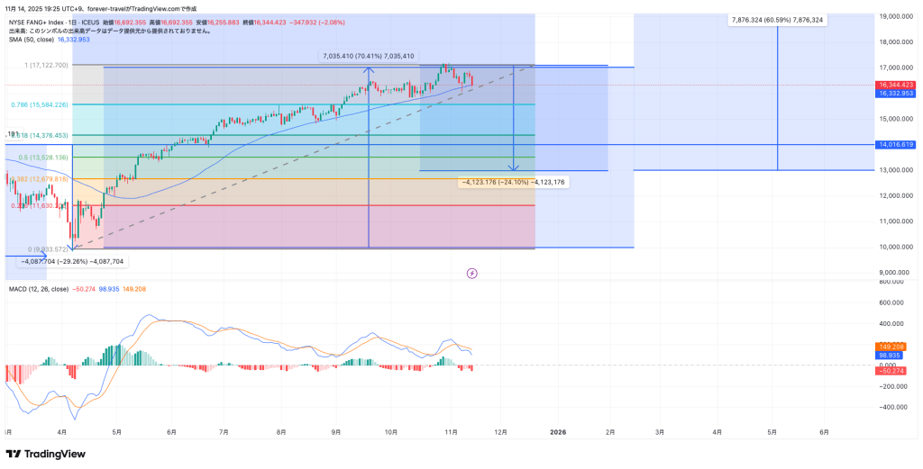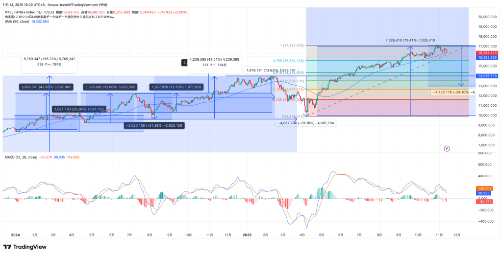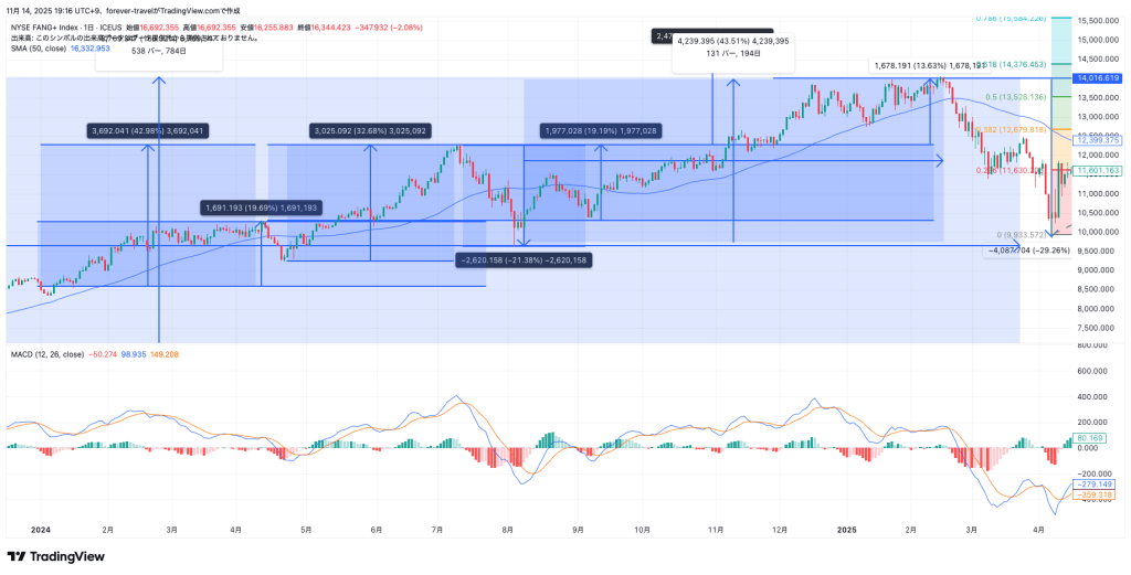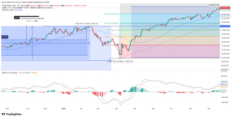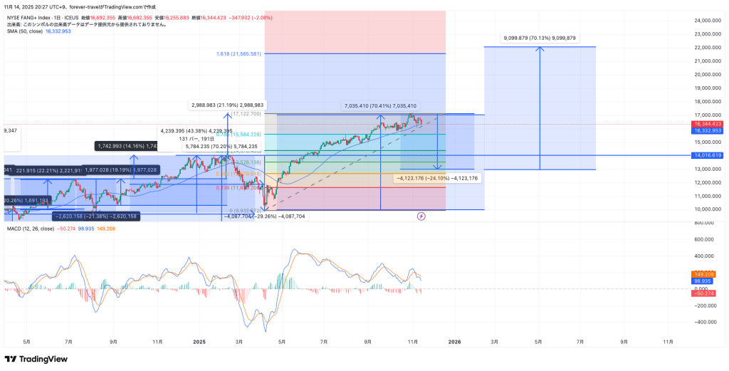 本記事は、移動平均線とMACDを中心に値動きを捉え、フィボナッチの押し目と拡張ラインで価格の層を判定し、下落率と上昇率の実績から今後の値幅を読み解く。読めば、FANG+の現在地と次のシナリオが自然と理解できるはずだ。