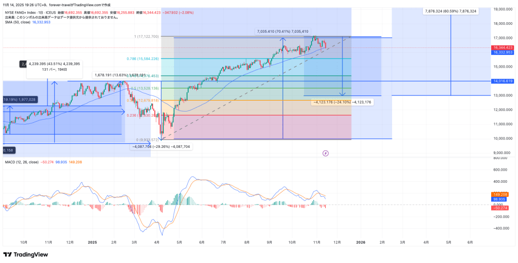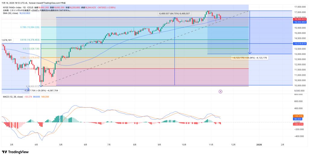 過去3年のデータを見ると、FANG+が50日線を割り込んだあとは平均で6〜12%ほどの調整を伴い、最終的にフィボナッチ38.2%や50%押しを確かめる展開が多い。この法則に従うなら、今回も14,600p〜13,500p付近が次のターゲットになりやすい。